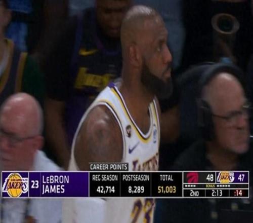 值得一提的是,此役过后,詹姆斯又迎来了里程碑时刻。在拿到这24分之后,詹姆斯的常规赛总得分就达到了42727分,同时他的季后赛总得分是8289分,这样一来,他常规赛+季后赛的总得分,就来到了51016分。他成为NBA历史上,唯一生涯总得分突破51000分的大神。