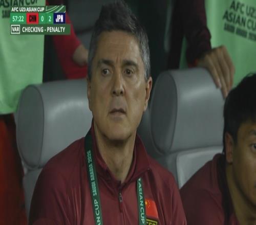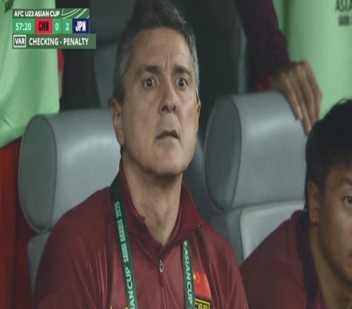 比赛第58分钟,U23国足被判罚点球,安东尼奥在替补席上有些无奈