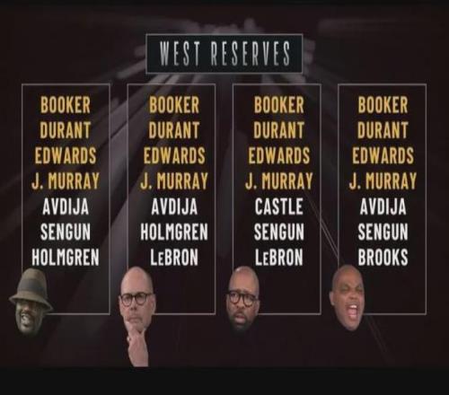 全明星替补阵容是由30支球队主教练投票选出,TNT天团这次投票虽然无法决定伦纳德是否入选全明星,但也间接表明了媒体对各个球员的态度。有四个球员是TNT天团四人共同选择的:布克、杜兰特、爱德华兹和贾马尔-穆雷。