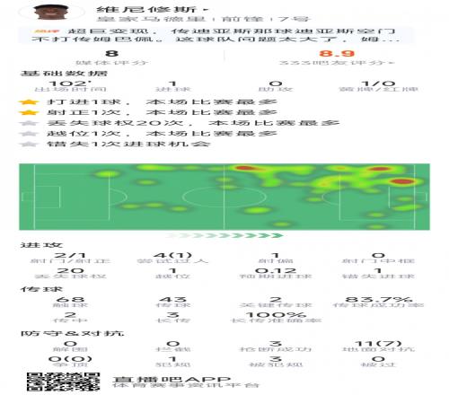 维尼修斯本场数据:1粒进球,2射1正,1次失良机,3次抢断